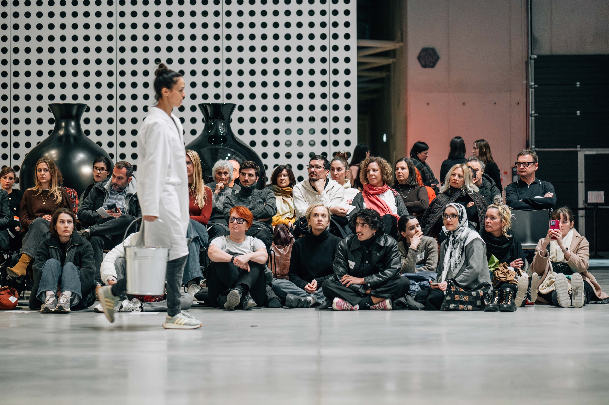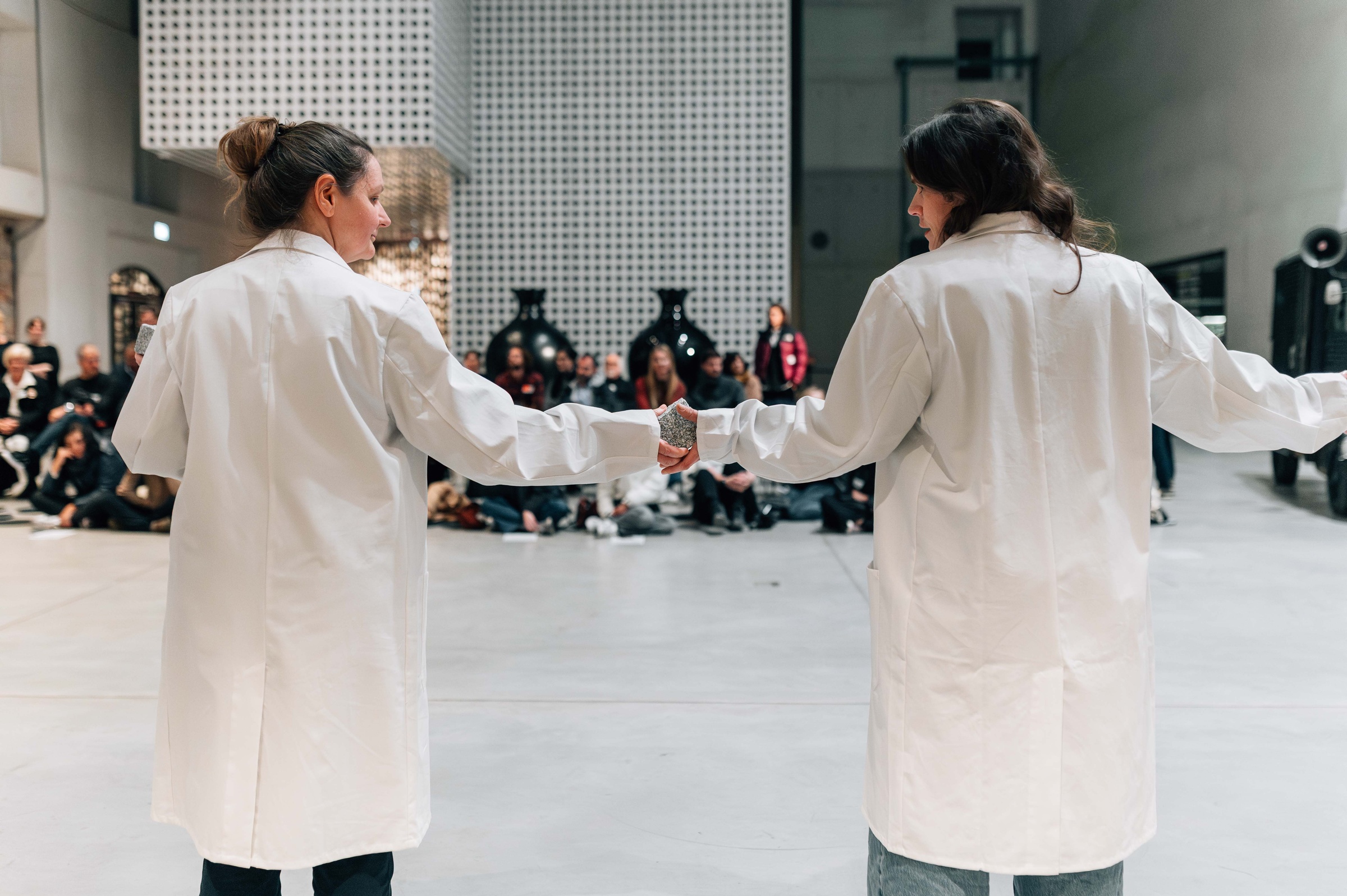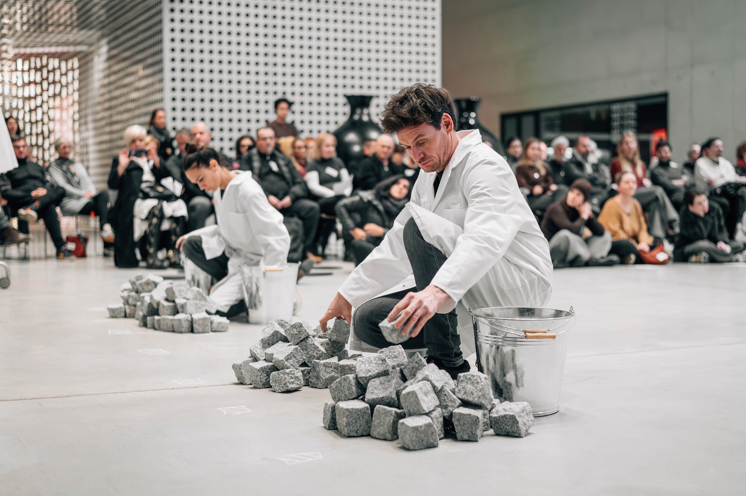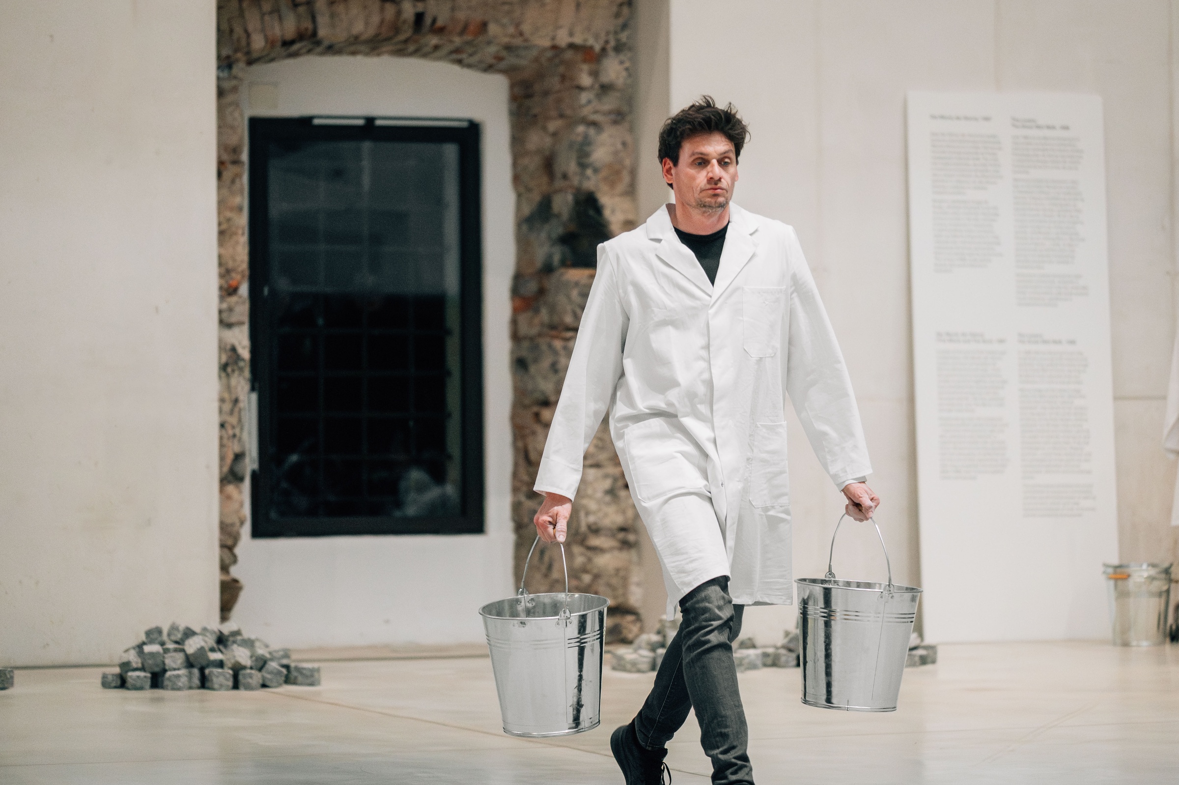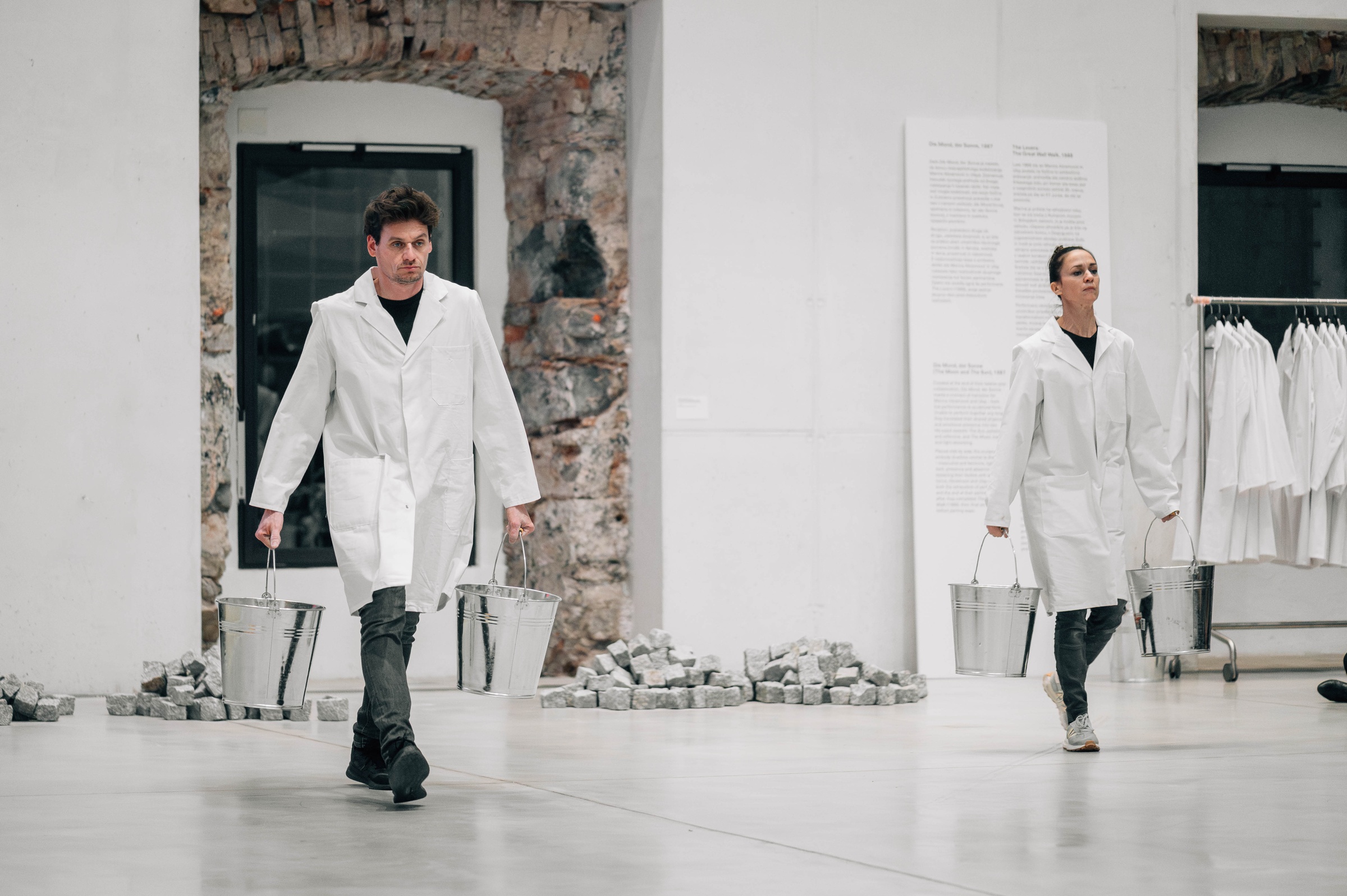 The re-performances constitute the live component of the exhibition: they reactivate iconic performances in the present, sharpen our perception that history remains in flux with and through us, and open up performance/art as a field for social change. In preparation for the performances, Stegnar and Bezjak participated in the Cleaning the House workshop at the Marina Abramović Institute in Karyes, Greece. For five days, the artists refrained from eating, speaking, reading, and were without watches, phones, and other electronics. During the workshop, they completed a series of long durational exercises expanding focus, stamina, and concentration.